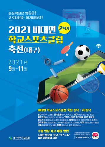[한국태권도신문] 대구시교육청(교육감 강은희)은 지난 18일(월)부터 11월 26일까지 코로나19로 위축된 학생들의 체력 증진과 1인 1스포츠 저변 확대를 위해 초, 중, 고 학생들을 대상으로 '2021 2학기 비대면 학교스포츠클럽 축전'을 운영한다.