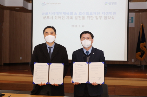 이날 총회에 앞서 군포시 장애인체육회와 효산의료재단 지샘병원과의 업무협약식도 열렸다.