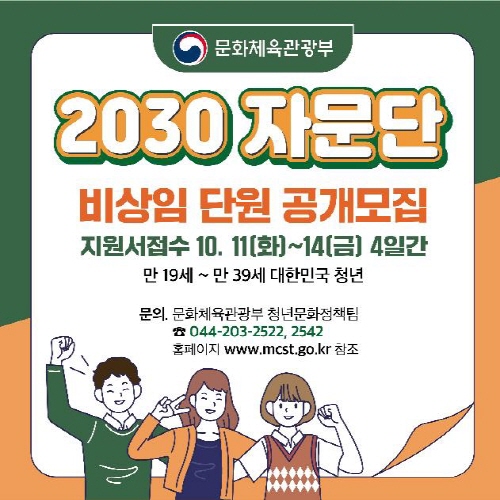 [한국태권도신문] 문화체육관광부(장관 박보균, 이하 문체부)는 개성과 창의성을 바탕으로 대한민국을 문화매력국가로 함께 만들어갈 청년세대 '2030 자문단'을 공모한다.