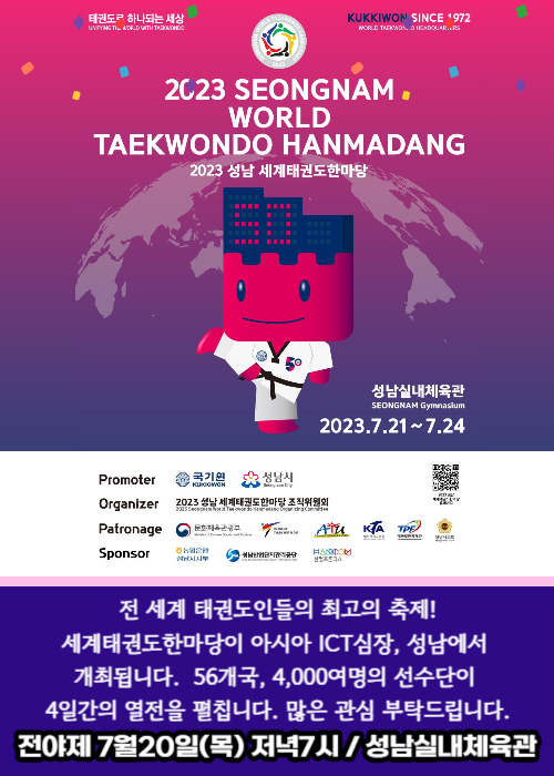 [한국태권도신문] '2023 성남 세계태권도한마당(7.21∼24)' 유치에 성공한 성남시는 오는 20일 오후 7시 성남실내체육관에서 연예인 등을 초청해 총 4000명 참여 규모의 전야제를 개최한다.