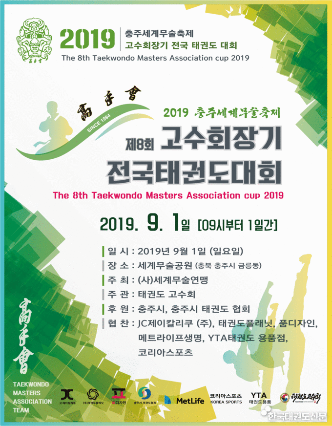(사)세계무술연맹이 주최하고 태권도고수회 조직위원회가 주관하는 제8회 태권도 고수회장기 전국태권도대회가 충주시와 충주시태권도협회의 후원으로 세계무술공원에서 개최된다. [한국태권도신문] 제8회 태권도고수회장기 전국태권도대회는 명인부와 우수부로 나뉜다. 명인부는 국기원 1품(단)증 소지자로서 심신의 결격이 없는 자로 2019년 대한태권도협회 품새 선수등록자 중에 명인부 참가를 희망하는 자이며, 우수부는 국기원 1품(단)증 소지자로서 심신이 결격이 없는 자와 유급자도 참여가 가능하다. ● 접수기간 : 2019년 8월5일 ~ 8월14일(수요일) 17시까지 ● 접수장소 : 태권도 조직위원회 사무총장 원명구 ● 제출방법 : E-mail 접수 edongnae@hanmail.net ● 접수사이트 : http://cafe.daum.net/tkdkosu (다음 카페 태권도고수회 검색) ● 자세한 문의사항 : 원명구 사무총장 010-7115-8173